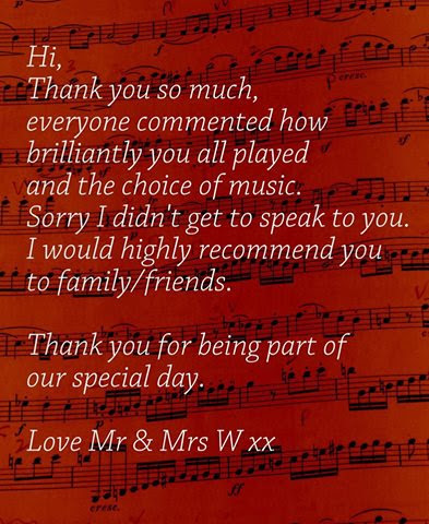 Brides love their lively contemporary repertoire of around hundred chart hits, music from Elbow to Mozart, Oasis to Beatles and Pachelbel Canon to Elton John. Their repertoire has grown enormously over the past two decades.